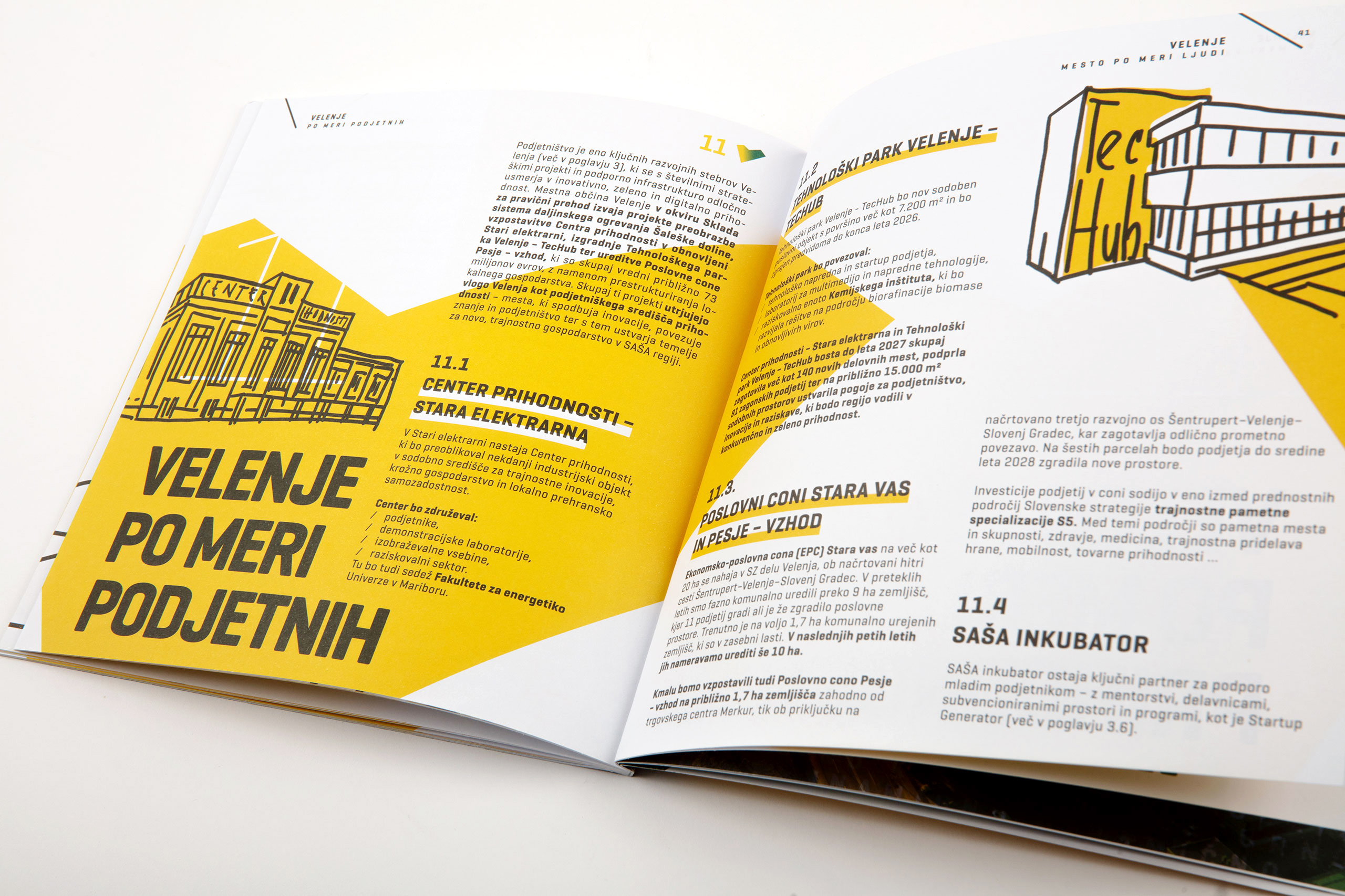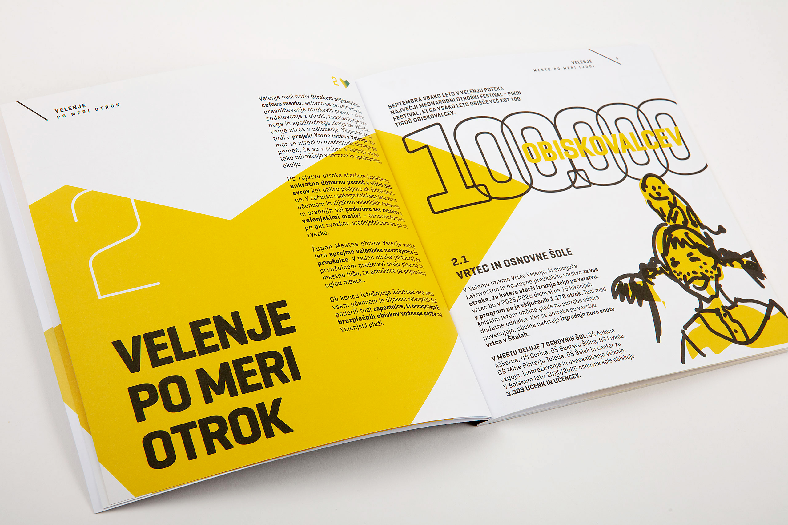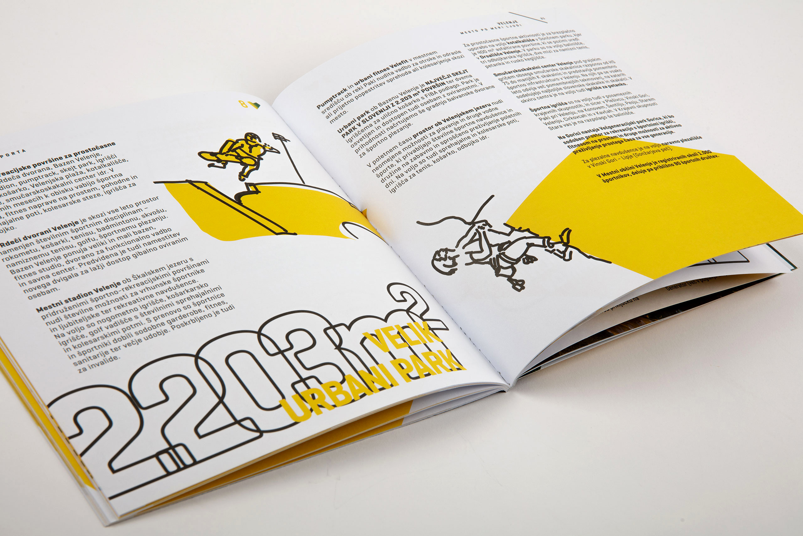 Oblikovali smo predstavitveno brošuro, ki prikazuje pot, po kateri gre Velenje, da postaja resnično mesto za vse generacije. Akromatičnim risbam, ki ilustrirajo vsebino, smo dodali akcente v obliki močno poudarjenih številk in opisov – dejstev, ciljev in načrtovanih investicij. Tako lahko bralec že ob hitrem prelistanju brošure dobi glavne informacije o poti, po kateri gre Velenje, ter o prihodnosti, ki jo mesto načrtuje in soustvarja.